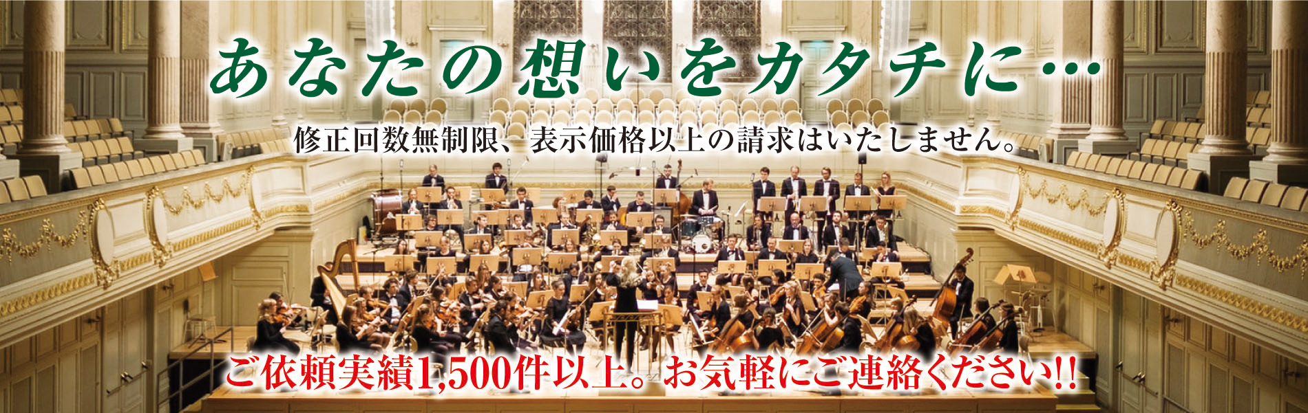 私たちは1990年より30年以上にわたり演奏会・コンサート・音楽会のチラシ、チケット、プログラム・パンフレット、ポスター等を専門に制作するデザイン・印刷会社です。低価格でデザイン作成からお引受けし、演奏家の皆さまにご負担のかからない演奏会・コンサートチラシのデザイン・印刷低価格を実現しました。そしてきめ細かなサービスと迅速な対応を心がけております。これまで全国に高品質な演奏会・コンサートチラシ、チケット、プログラム・パンフレットを1,500件以上お届けし、多くのお客さまより高い評価をいただいております。